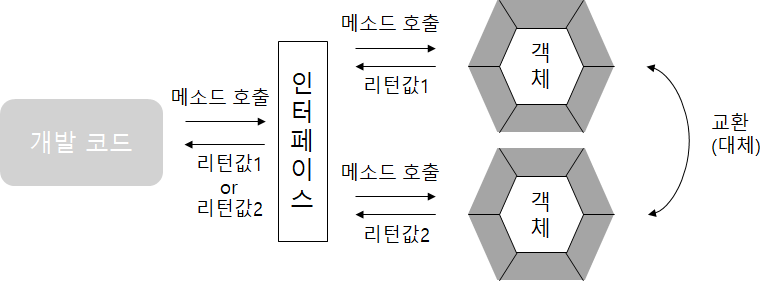 -> 인터페이스는 하나의 객체가 아니라 여러 객체들과 사용이 가능하므로 어떤 객체를 사용하느냐에 따라 실행 내용과 리턴값이 다를 수 있다.