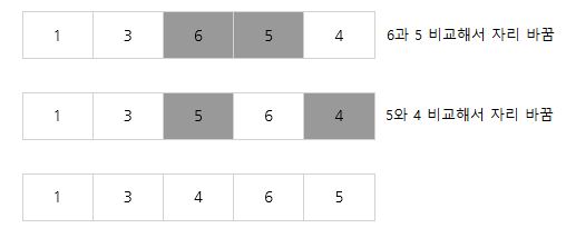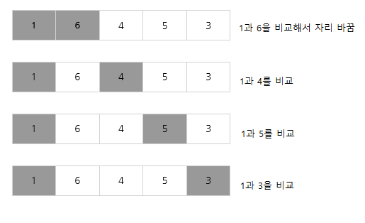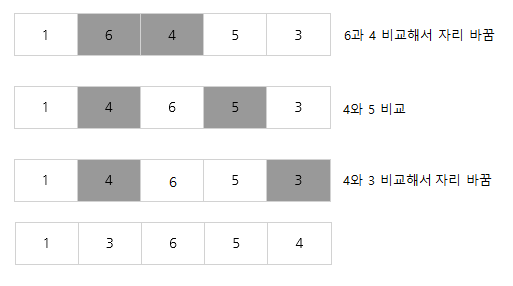 - 배열에 1, 6, 4, 5, 3 이 저장되어있다고 가정 -> 오름차순 정렬