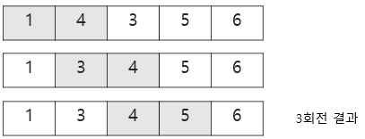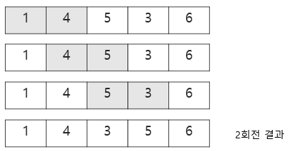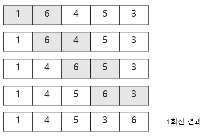 - 배열에 1, 6, 4, 5, 3 이 저장되어있다고 가정 -> 오름차순 정렬