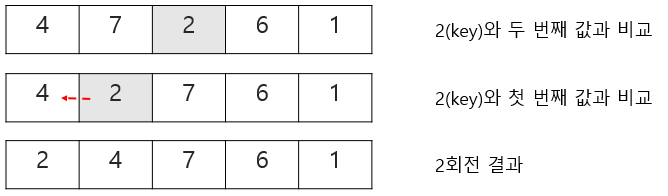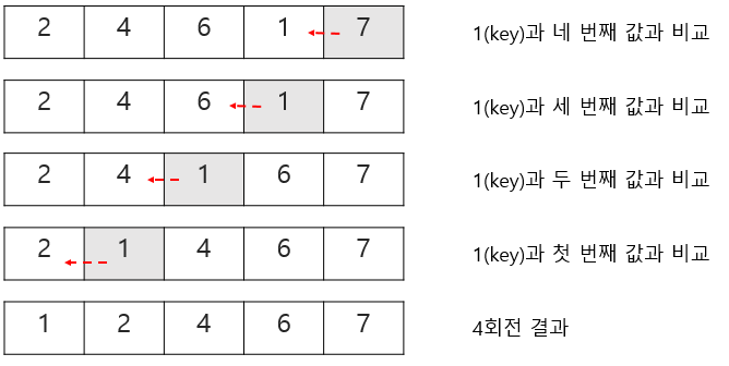 - 배열에 7, 4, 2, 6, 1 이 저장되어있다고 가정 -> 오름차순 정렬