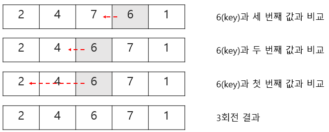 : 삽입 정렬은 두 번째 자료부터 시작하여 그 앞(왼쪽)의 자료들과 비교하여 삽입할 위치를 지정한 후 자료를 뒤로 옮기고 지정한 자리에 자료를 삽입하여 정렬하는 알고리즘이다. 즉, 두 번째 자료는 첫 번째 자료, 세 번째 자료는 두 번쨰와 첫 번째 자료, 네 번째 자료는 세 번째, 두 번째, 첫 번째 자료와 비교한 후 자료가 삽입될 위치를 찾는다. 자료가 삽입될 위치를 찾았다면 그 위치에 자료를 삽입하기 위해 자료를 한 칸씩 뒤로 이동시킨다.