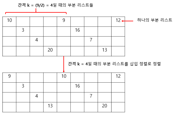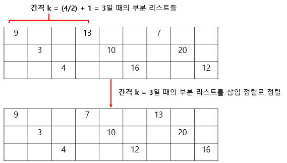 - 정렬해야 할 리스트의 각 k번째 요소를 추출해서 부분 리스트 생성, 이때 k를 간격(gap)이라고 한다.
