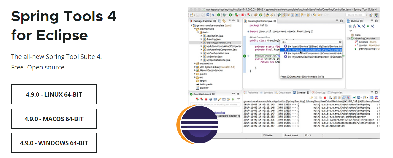 Largely rebuilt from scratch, Spring Tools 4 provides world-class support for developing Spring-based enterprise applications, whether you prefer Eclipse, Visual Studio Code, or Theia IDE.